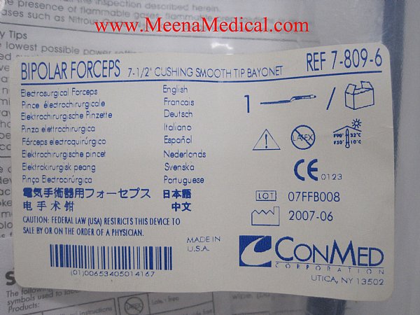 ConMed Bipolar Forceps Cushing REF 7-809-6 - New VENDOR DESCRIPTION: Cushing Smooth Tips 7-809-6 Bayonet, insulated, 7 1/2in. (19.0cm) overall, 2.0cm tip. Requires foot switch and #7-809-11 bipolar cord. CONTENTS: Qty 1 - ConMed 7-809-6 Bipolar Forceps 7.5" Cushing Smooth Tip Bayonet CONDITION: Cosmetic: New Working: New
